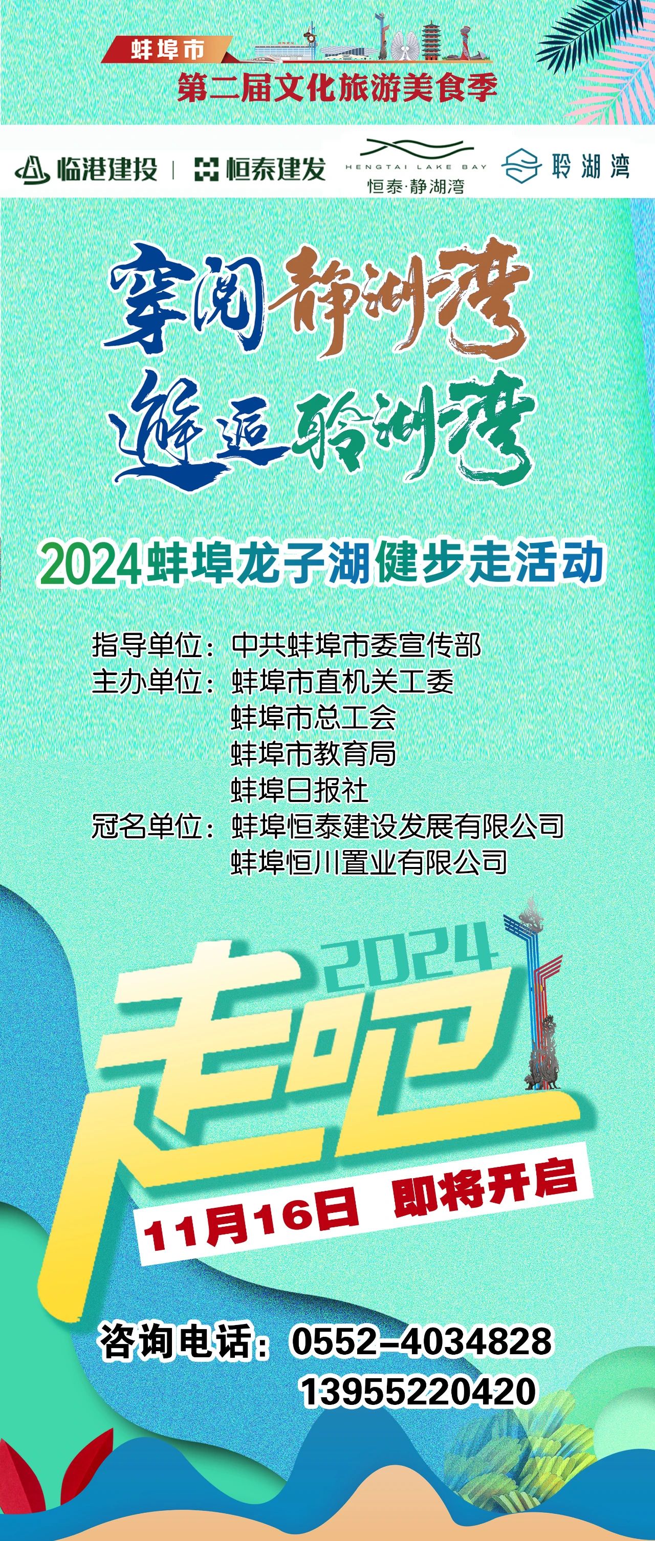 11月16日 ,“穿閱靜湖灣,邂逅聆湖灣”2024龍子湖健步走活動在中共蚌埠市委宣傳部的指導下,由蚌埠市直機關工委、蚌埠市總工會、蚌埠市教育局、蚌埠日報社聯(lián)合主辦,蚌埠恒泰建設發(fā)展有限公司、蚌埠恒川置業(yè)有限公司共同冠名,即將盛大開啟,邀您參與!